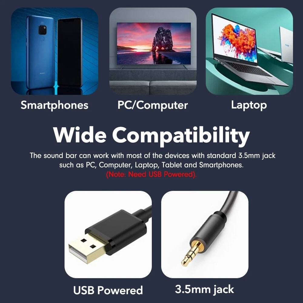 LED USB Powered Wired Sound Bar Bass Speakers TV Computer For PC Desktop Tablets